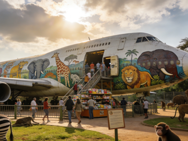 退役波音747:动物园里的时空纪念馆 当巨大的波音747机身停驻在动物园的绿野间,一场工业文明与自然生命的奇妙邂逅就此展开。这架曾翱翔于云端的民航客机,褪去了飞行的使命,被改造成一座独特的动物园纪念馆,机身绘满斑斓的动物涂鸦——昂首的长颈鹿、威严的狮子、憨厚的大象,仿佛将非洲草原的生机与活力凝固在金属外壳上。 游客们沿着扶梯步入机舱,这里不再是客舱,而是充满童趣与科普的纪念品商店与动物